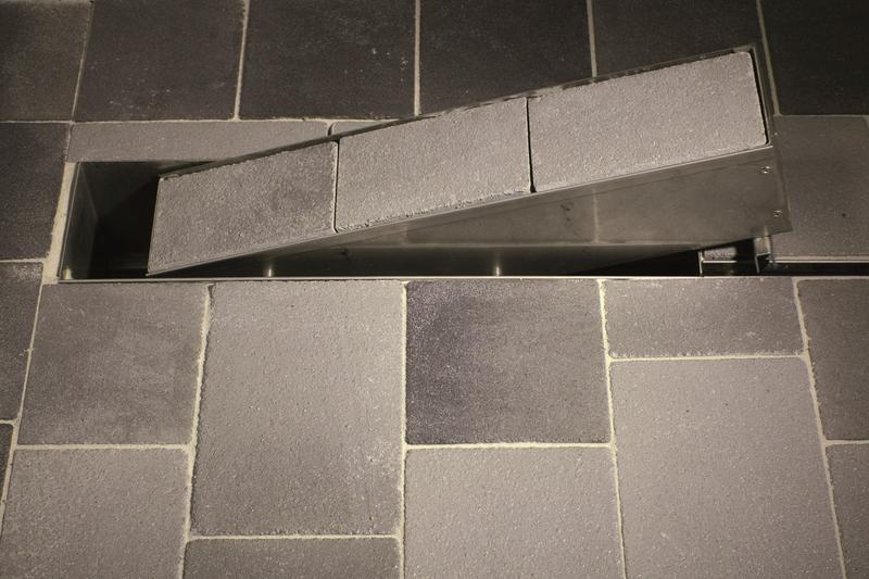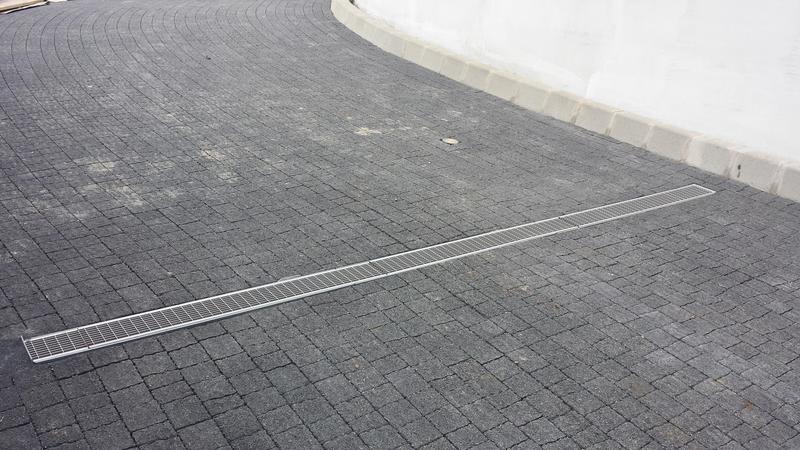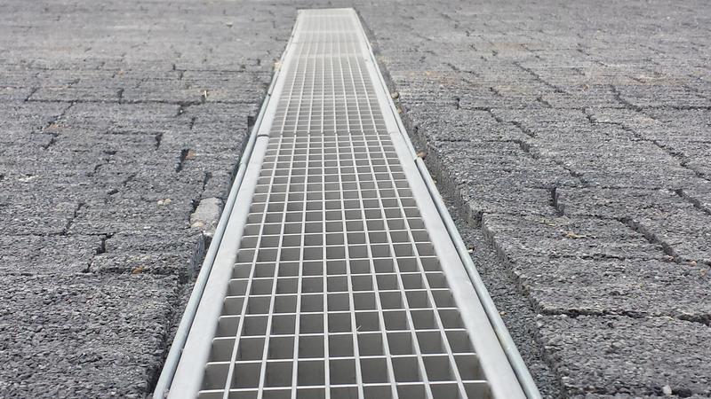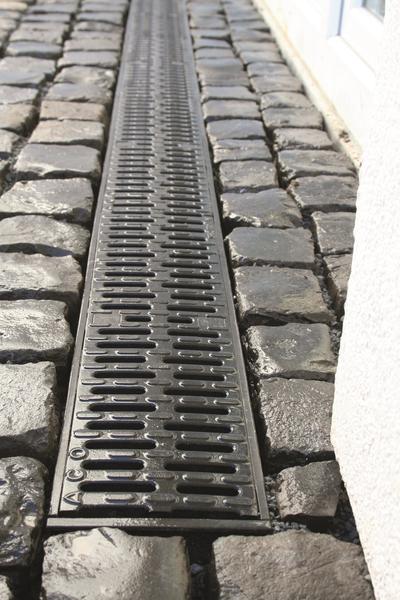 XtraDrain típusú vonalmenti vízelvezetô rendszer az EN 1433 szabványnak megfelelôen, V keresztmetszettel, 10,0 - 20,0 cm belsô szélességgel, A15-C250 terhelési osztályban, Drainlock típusú rácsrögzítéssel, műanyag élvédelemmel.